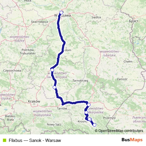 The first stop of the Flixbus bus route is Sanok Lipinskiego and the last stop is Warszawa Bus Station. Flixbus (Sanok - Warsaw) is operational during everyday.