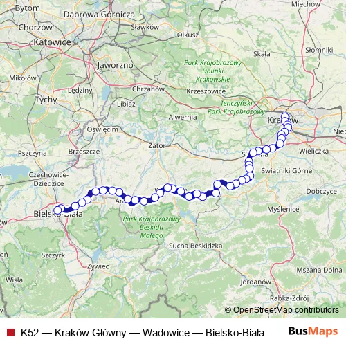 The first stop of the K52 rail route is Kraków Główny and the last stop is Bielsko-Biała Główna. K52 (Kraków Główny — Wadowice — Bielsko-Biała) is operational during everyday.