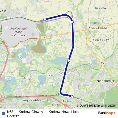 Click here to view the nearest K63 - Kraków Główny — Kraków Nowa Huta — Podłęże rail stop.