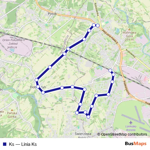 The first stop of the Ks bus route is Turaszówka Skrzyżowanie 03 and the last stop is Polanka Kościół 01. Ks (Linia Ks) is operational during on weekdays.
