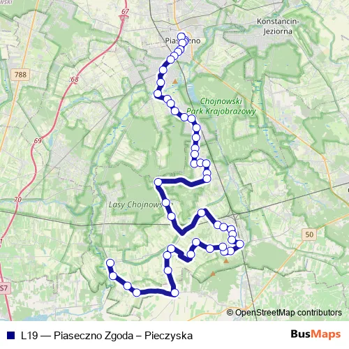 The first stop of the L19 bus route is Piaseczno Zgoda and the last stop is Prażmów Urząd Gminy. L19 (Piaseczno Zgoda – Pieczyska) is operational during everyday.