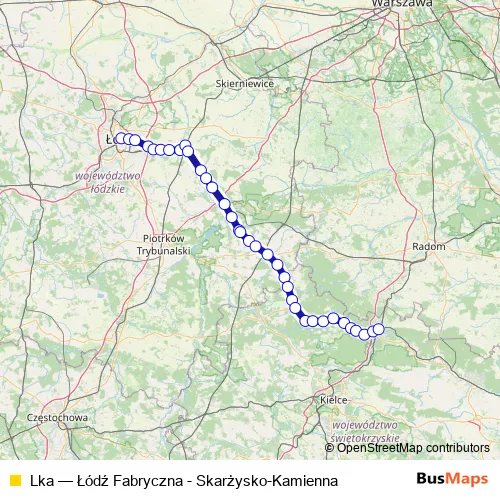 The first stop of the Lka rail route is Łódź Fabryczna and the last stop is Skarżysko-Kamienna. Lka (Łódź Fabryczna - Skarżysko-Kamienna) is operational during everyday.