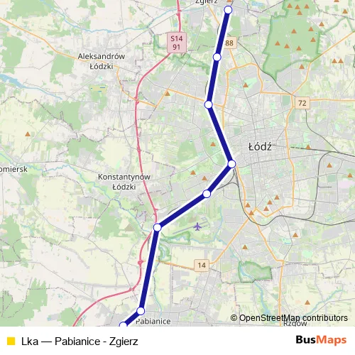 The first stop of the Lka rail route is Pabianice and the last stop is Zgierz. Lka (Pabianice - Zgierz) is operational during on weekdays.