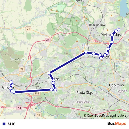 The first stop of the M16 bus route is Osiedle Wieczorka Dworzec and the last stop is Gliwice Centrum Przesiadkowe. M16 is operational during everyday.