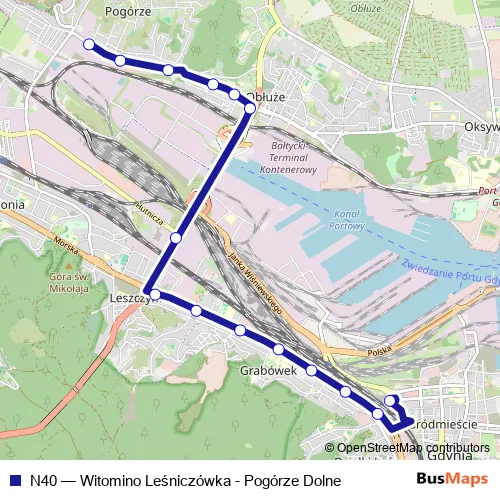 The first stop of the N40 bus route is Pogórze Dolne 01 and the last stop is Gdynia Dworzec Gł. PKP 04. N40 (Witomino Leśniczówka - Pogórze Dolne) is operational during everyday.