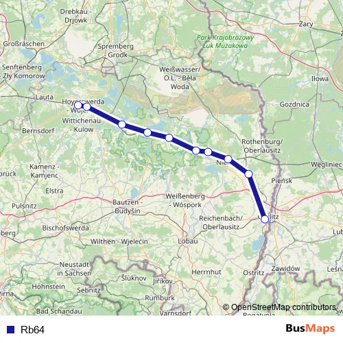The first stop of the Rb64 bus route is Görlitz Bahnhof and the last stop is