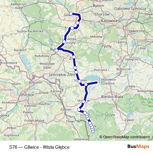 The first stop of the S76 rail route is Wisła Głębce and the last stop is Gliwice. S76 (Gliwice - Wisła Głębce) is operational during on weekends.