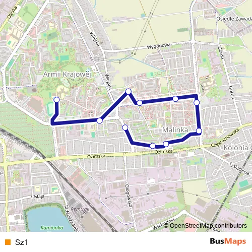 The first stop of the Sz1 bus route is Szarych Szeregów - Szkoła (952) and the last stop is Wiejska - Ozimska (366). Sz1 is operational during on weekdays.