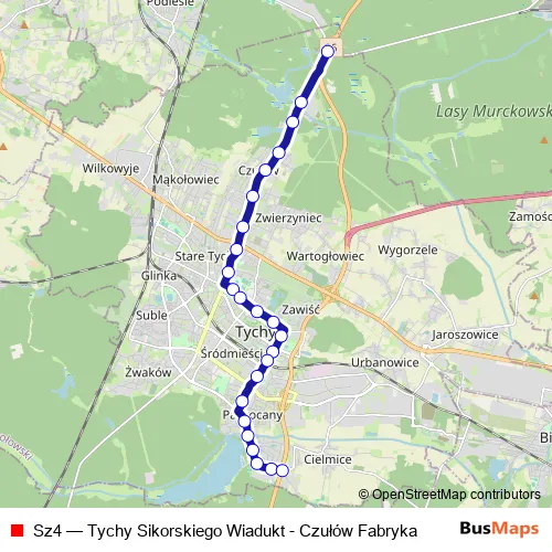 The first stop of the Sz4 bus route is Czułów Droga do Kostuchny and the last stop is Tychy Sikorskiego Wiadukt. Sz4 (Tychy Sikorskiego Wiadukt - Czułów Fabryka) is operational during everyday.
