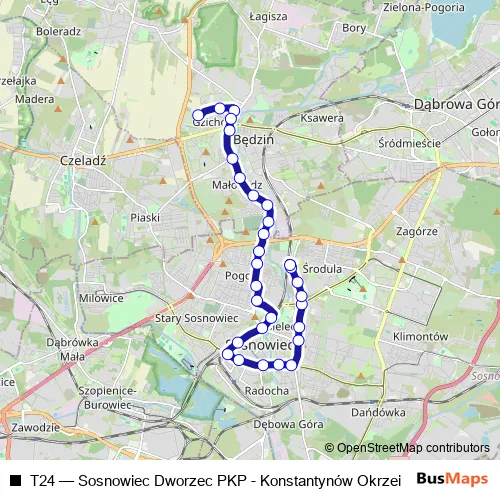 The first stop of the T24 tram route is Os. Zamkowe Zajezdnia and the last stop is Konstantynów Okrzei. T24 (Sosnowiec Dworzec PKP - Konstantynów Okrzei) is operational during everyday.