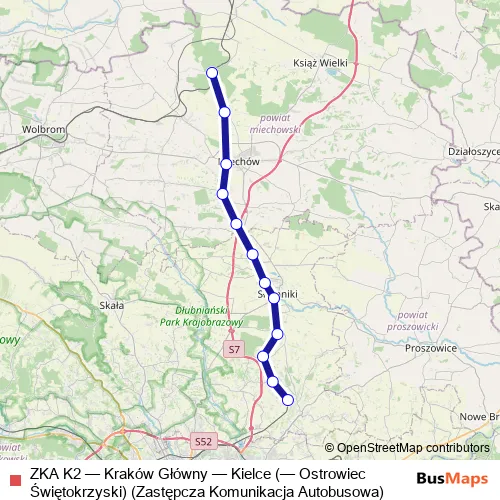Click here to view the nearest ZKA K2 - Kraków Główny — Kielce (— Ostrowiec Świętokrzyski) (Zastępcza Komunikacja Autobusowa) bus stop.