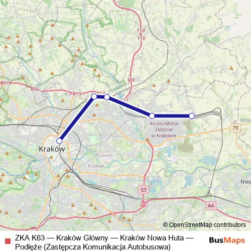 The first stop of the ZKA K63 bus route is Kraków Nowa Huta and the last stop is Kraków Główny. ZKA K63 (Kraków Główny — Kraków Nowa Huta — Podłęże (Zastępcza Komunikacja Autobusowa)) is operational during everyday.