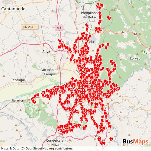 Transit map showing estaticos-servicos-municipalizado routes and stops in Portugal