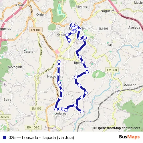 The first stop of the 025 bus route is Nespereira (Tv. Dr. Afonso Quintela) and the last stop is Lousada (Eb23). 025 (Lousada - Tapada (via Juia)) is operational during on weekdays.