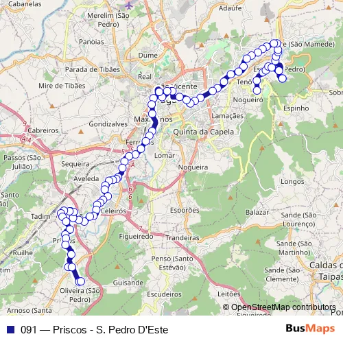 The first stop of the 091 bus route is S. Pedro d´Este (Estrada S Pedro II-Arco) and the last stop is Priscos (Outeiro Ii). 091 (Priscos - S. Pedro D'Este) is operational during on weekends.