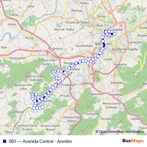 The first stop of the 093 bus route is Central Ii and the last stop is Arentim (Crasto). 093 (Avenida Central - Arentim) is operational during on weekends.