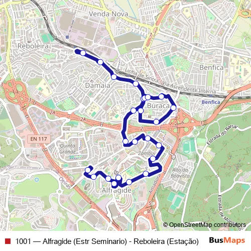 Bus 1001 - Alfragide (Estr Seminario) - Reboleira (Estação) in Lisbon: Stops & Timetable