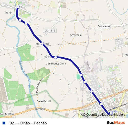 The first stop of the 102 bus route is Pechão (R. Francisco Guerreiro) and the last stop is Olhão (Terminal Rodoviário). 102 (Olhão – Pechão) is operational during on weekdays.