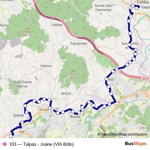 The first stop of the 103 bus route is Joane (AV. República) and the last stop is Taipas (Esc. Sec.) Este. 103 (Taipas - Joane (VIA Brito)) is operational during on weekdays.