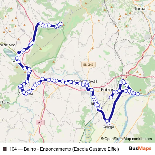 The first stop of the 104 bus route is Escola Profissional Gustave Eiffel and the last stop is Bairro (R. da Escola). 104 (Bairro - Entroncamento (Escola Gustave Eiffel)) is operational during on weekdays.