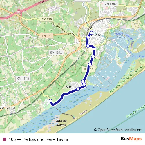 The first stop of the 105 bus route is Pedras d'El Rei and the last stop is Tavira (Terminal Rodoviário). 105 (Pedras d`el Rei – Tavira) is operational during on weekdays.
