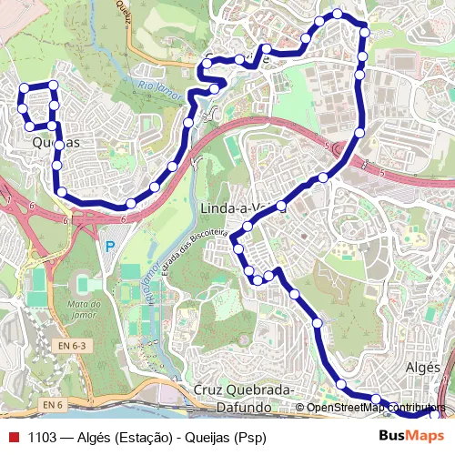 The first stop of the 1103 bus route is Algés (Estação) P10 and the last stop is Queijas (Psp). 1103 (Algés (Estação) - Queijas (Psp)) is operational during everyday.
