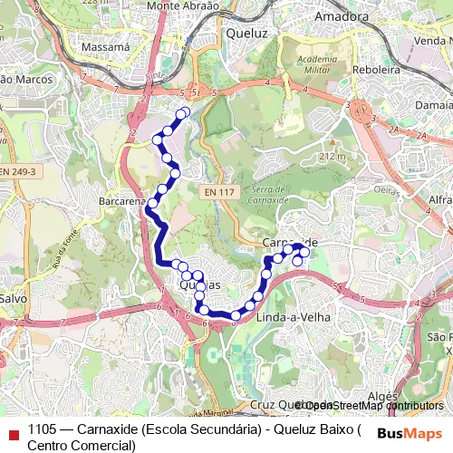 The first stop of the 1105 bus route is Queluz de Baixo and the last stop is Carnaxide (Escola Secundária). 1105 (Carnaxide (Escola Secundária) - Queluz Baixo (Centro Comercial)) is operational during on weekdays.