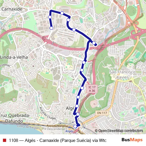 Click here to view the nearest 1108 - Algés - Carnaxide (Parque Suécia) via Wtc bus stop.