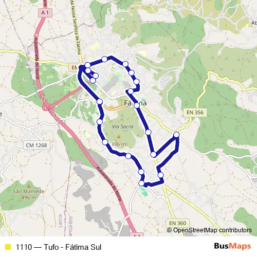 The first stop of the 1110 bus route is Terminal Rodoviário / Santuário and the last stop is Terminal Rodoviário / Santuário. 1110 (Tufo - Fátima Sul) is operational during on weekdays.