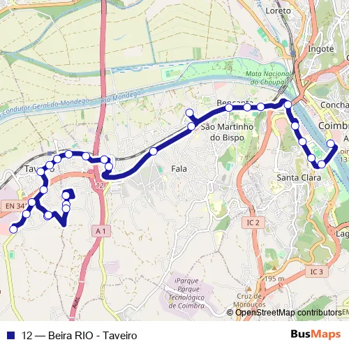 The first stop of the 12 bus route is Portagem (Beira Rio) and the last stop is Taveiro (Zona Comercial). 12 (Beira RIO - Taveiro) is operational during everyday.