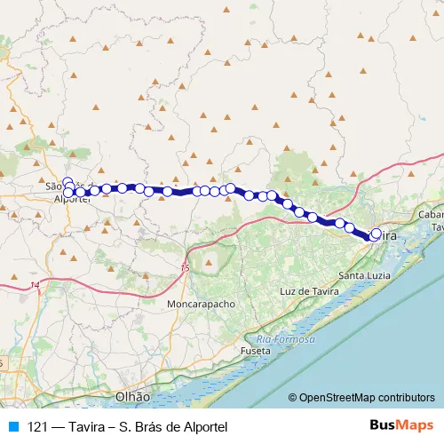 The first stop of the 121 bus route is S. Brás Alportel (Terminal Circular) and the last stop is Tavira (Terminal Rodoviário). 121 (Tavira – S. Brás de Alportel) is operational during on weekdays.