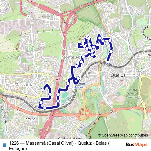 The first stop of the 1226 bus route is Queluz - Belas (Estação) and the last stop is Massamá (Casal Olival). 1226 (Massamá (Casal Olival) - Queluz - Belas (Estação)) is operational during everyday.