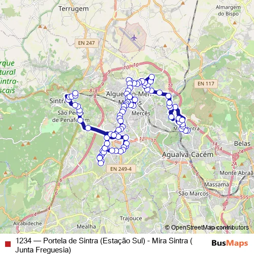 The first stop of the 1234 bus route is Mira Sintra (Junta Freguesia) and the last stop is Portela de Sintra (Estação) P10 Entrada Sul. 1234 (Portela de Sintra (Estação Sul) - Mira Sintra (Junta Freguesia)) is operational during everyday.