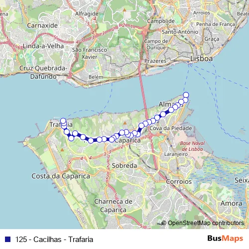 Additional information: 125 - Cacilhas - Trafaria has 31 stops and the total trip duration for this route is approximately 34 minutes.