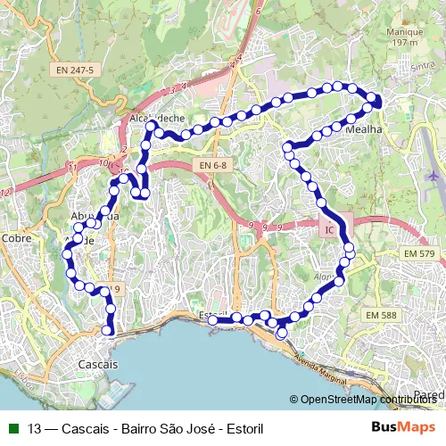 The first stop of the 13 bus route is Estoril - Estação and the last stop is Cascais - Terminal. 13 (Cascais - Bairro São José - Estoril) is operational during everyday.