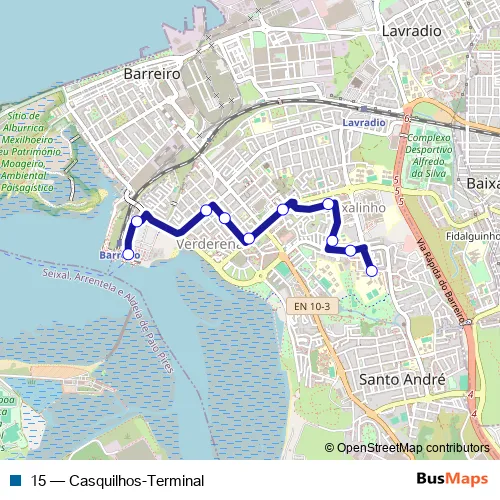 The first stop of the 15 bus route is Esc. Secundária dos Casquilhos and the last stop is Terminal do Barreiro. 15 (Casquilhos-Terminal) is operational during on weekdays.