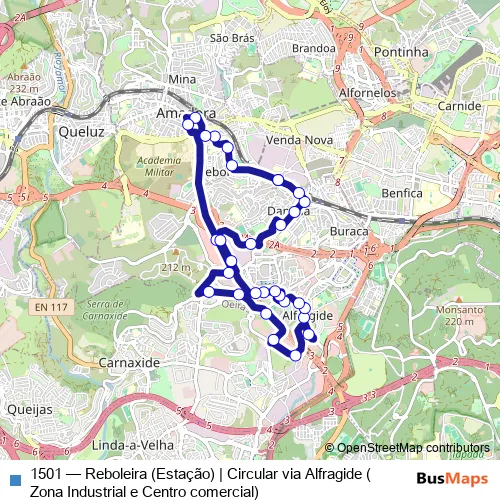 Bus 1501 - Reboleira (Estação) | Circular via Alfragide (Zona Industrial e Centro comercial) in Lisbon: Stops & Timetable