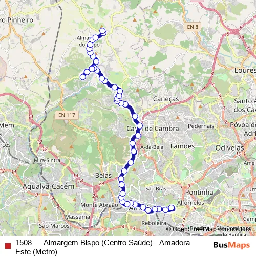 The first stop of the 1508 bus route is Amadora Este (Metro) P4 and the last stop is Almargem Bispo (Centro saúde). 1508 (Almargem Bispo (Centro Saúde) - Amadora Este (Metro)) is operational during everyday.