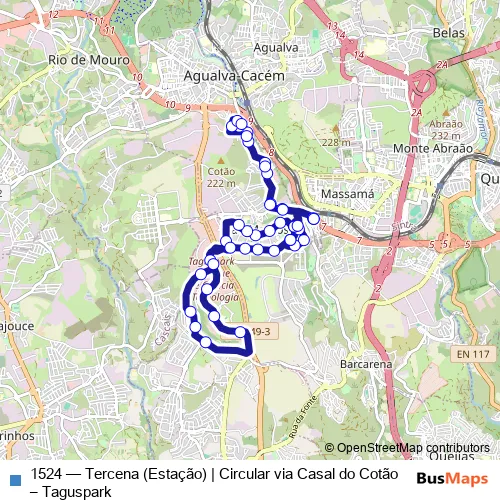 The first stop of the 1524 bus route is Estação Tercena and the last stop is Estação Tercena. 1524 (Tercena (Estação) | Circular via Casal do Cotão – Taguspark) is operational during everyday.