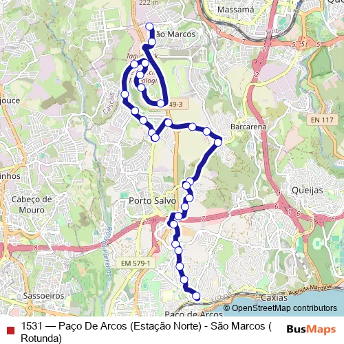 The first stop of the 1531 bus route is São Marcos (Rotunda) and the last stop is Paço De Arcos (Estação Norte). 1531 (Paço De Arcos (Estação Norte) - São Marcos (Rotunda)) is operational during on weekdays.
