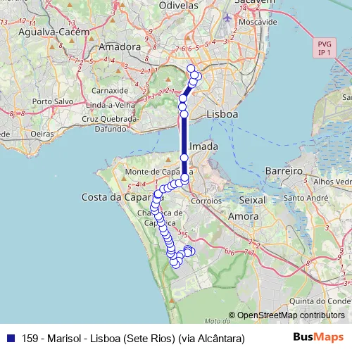 Additional information: 159 - Marisol - Lisboa (Sete Rios) (via Alcântara) has 44 stops and the total trip duration for this route is approximately 55 minutes.