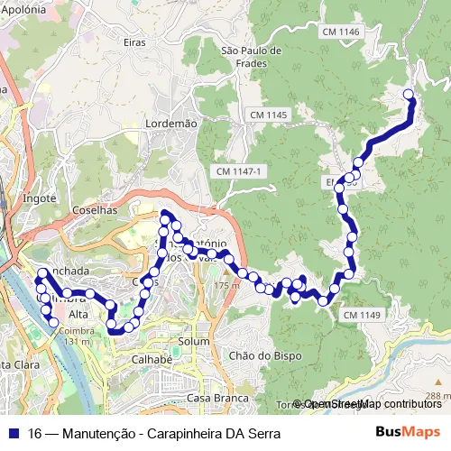 See why over 2 million users trust and consider busmaps.com as the best public transport website. busmaps gives you Coimbra Buses suggested routes, real-time bus tracker, line route maps in Coimbra, and helps to find the closest 16 bus stops near you. No internet available? Download an offline PDF map and bus schedule for the 16 bus to take on your trip.