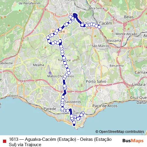 The first stop of the 1613 bus route is Oeiras (Estação) P9 Entrada Sul and the last stop is Agualva-Cacém (Estação) P10. 1613 (Agualva-Cacém (Estação) - Oeiras (Estação Sul) via Trajouce) is operational during everyday.