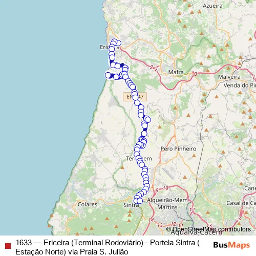 Bus 1633 - Ericeira (Terminal Rodoviário) - Portela Sintra (Estação Norte) via Praia S. Julião Schedule in Sintra