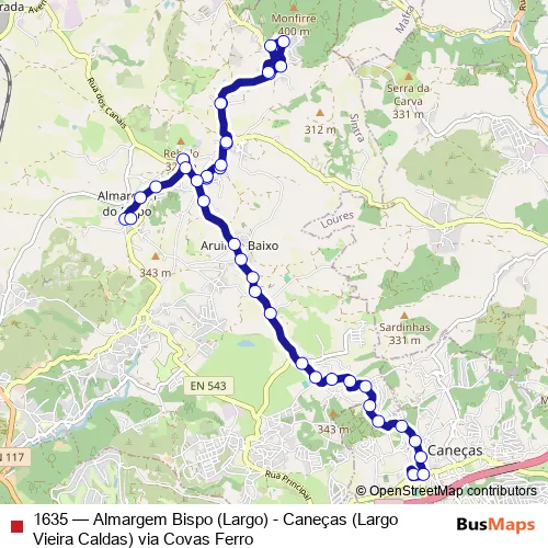 The first stop of the 1635 bus route is Caneças (Largo Vieira Caldas) and the last stop is R da Serra (X) R Amália Rodrigues. 1635 (Almargem Bispo (Largo) - Caneças (Largo Vieira Caldas) via Covas Ferro) is operational during everyday.
