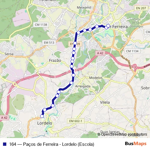 See why over 2 million users trust and consider busmaps.com as the best public transport website. busmaps gives you Pacos de Ferreira Buses suggested routes, real-time bus tracker, line route maps in Pacos de Ferreira, and helps to find the closest 164 bus stops near you. No internet available? Download an offline PDF map and bus schedule for the 164 bus to take on your trip.