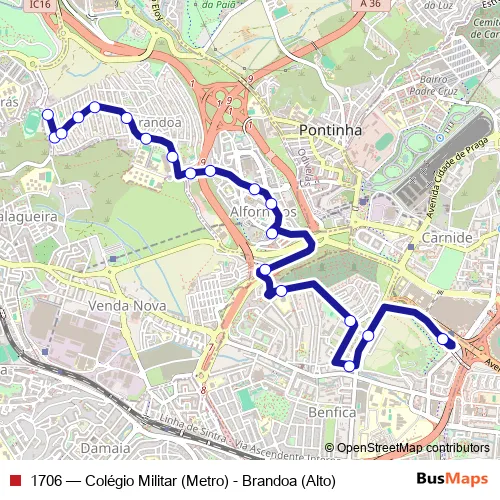 The first stop of the 1706 bus route is Brandoa (Alto) and the last stop is Colégio Militar (Metro) P2. 1706 (Colégio Militar (Metro) - Brandoa (Alto)) is operational during everyday.