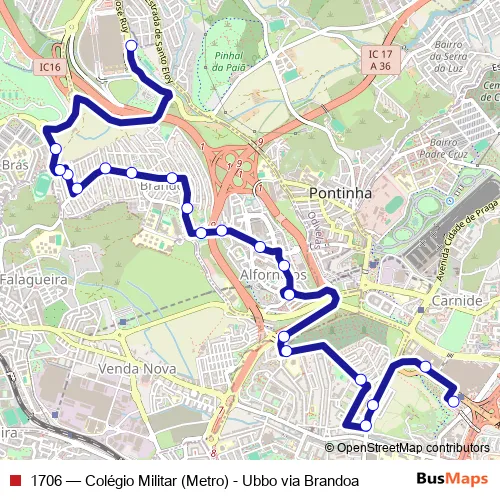 The first stop of the 1706 bus route is Colégio Militar (Metro) P2 and the last stop is Casal da Mira (Centro Comercial) P4. 1706 (Colégio Militar (Metro) - Ubbo via Brandoa) is operational during everyday.