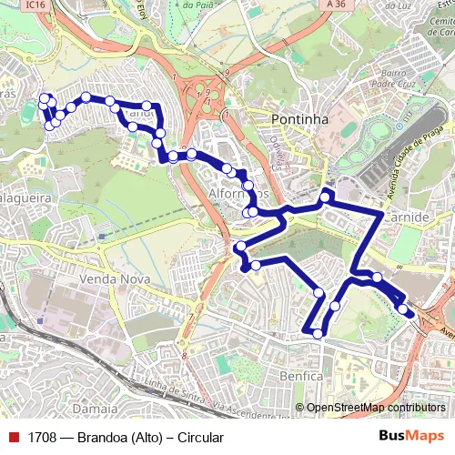 The first stop of the 1708 bus route is Brandoa (Alto) and the last stop is Brandoa (Alto). 1708 (Brandoa (Alto) – Circular) is operational during everyday.