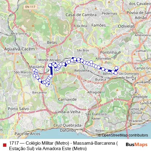 The first stop of the 1717 bus route is Massamá - Barcarena (Estação Sul) and the last stop is Colégio Militar (Metro) P13. 1717 (Colégio Militar (Metro) - Massamá-Barcarena (Estação Sul) via Amadora Este (Metro)) is operational during everyday.